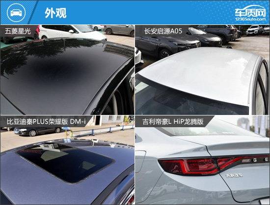 外觀方面,四款車型均有明顯的家族化設計元素,具有很高的辨識度。其中,長安啟源A05和吉利帝豪L HiP龍騰版采用半封閉式前格柵,視覺效果更接近純電動車型。五菱星光和比亞迪秦PLUS榮耀版 DM-i則是保留了傳統進氣格柵,前者的格柵采用全黑設計,后者則是格柵內部采用點陣式設計。