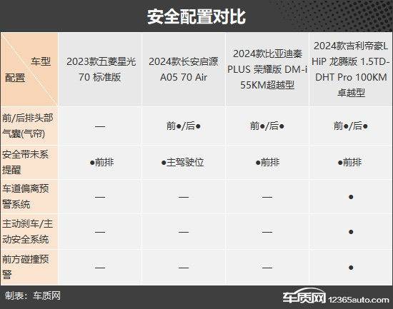 安全配置方面,受制于成本的因素,四款車型整體表現一般。其中,五菱星光在被動安全配置方面存在缺失,是四款車中唯一一款未配備前/后排頭部氣囊(氣簾)的車型。相比之下,吉利帝豪L HiP龍騰版的整體表現最佳,獨享車道偏離預警系統、主動剎車/主動安全系統、前方碰撞預警,給日常行車帶來更多安全保護。