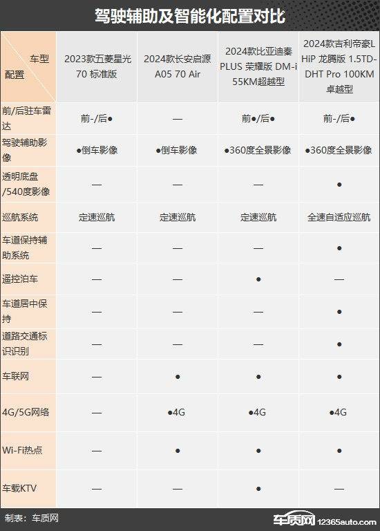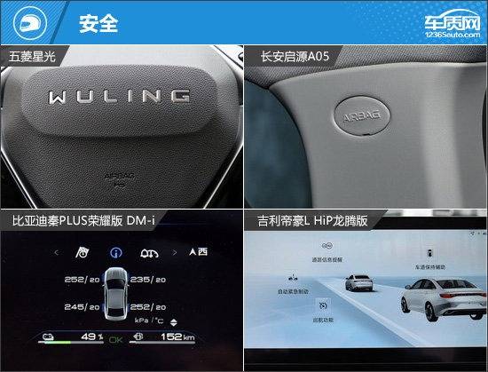 駕駛輔助功能方面,吉利帝豪L HiP龍騰版表現最佳,獨享全速自適應巡航、車道保持輔助系統、車道居中保持、道路交通標識識別。比亞迪秦PLUS榮耀版 DM-i通過獨享遙控泊車,成功扳回一城。五菱星光和長安啟源A05整體表現一般。